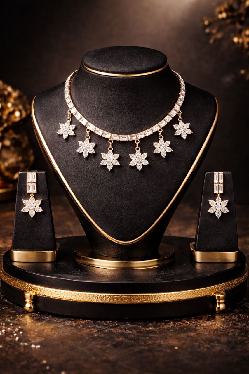 An elegant floral drop necklace set designed with sparkling flower-shaped stones and a sleek baguette-style chain in a luxurious rose gold finish.