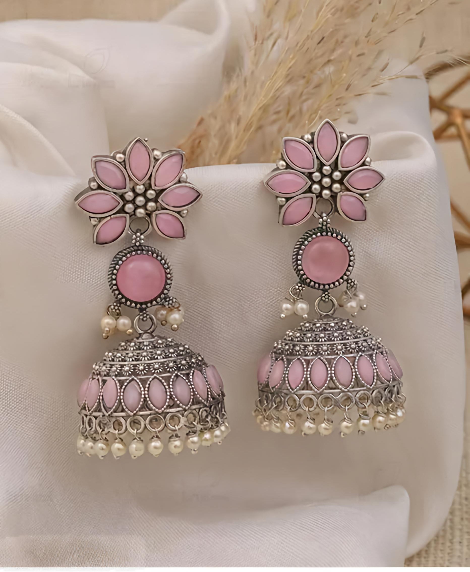 Enhance your ethnic look with these Royal Petal Jhumka Earrings, designed with a beautiful floral stud and classic jhumka silhouette. Crafted in premium oxidised silver finish, these earrings feature vibrant stone petals and delicate pearl drops that add elegance and charm to every outfit.